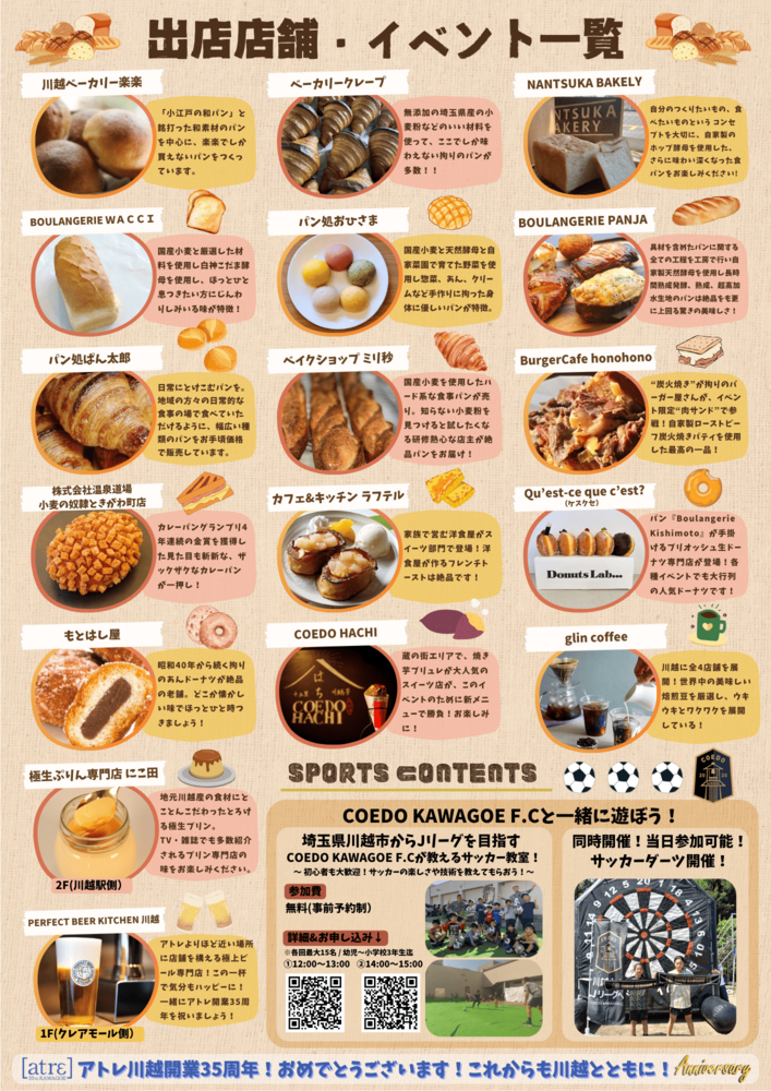 今回は、アトレ川越開業35周年記念!川越の人気パン屋さんやスイーツ屋さんを中心に17店舗、その他にも棒パンBBQなどのこの日限定の催しものや、COEDO KAWAGOE F.Cコラボ、サッカーボールパンのデコレーションなど、スペシャルコンテンツも充実!